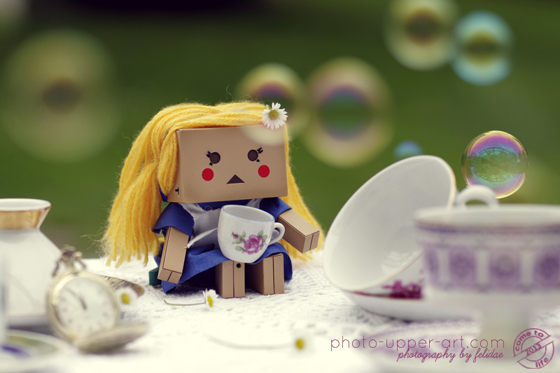 Als Lilly endlich den großen Wald verlassen hatte, stand sie unmittelbar vor einer langen, gedeckten Tafel. Neugierig machte sie sich daran auf den Tisch zu klettern. Oben angekommen staunte sie dann nicht schlecht. Bunt zusammen gewürfelte Teeservice, Kannen, Zucker, Blümchen waren auf dem Tisch verstreut. Am Ende des Tisches saß ein Herr mit einem komischen Hut. Eine Raupe und ein Kaninchen waren ebenfalls in Gesellschaft. Alle schauten Lilly einen kurzen Moment an, dann baten sie sie Platz zunehmen und mit Ihnen ein Tässchen Tee zu trinken. Es wurde eine ausgelassene Tee-Party, bis die Taschenuhr des Kaninchens klingelte und Lilly’s Traum wie eine Seifenblase zerplatzte…